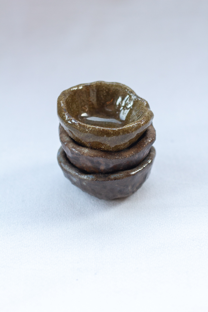 Gres negro chamotado, esmaltes del taller: nº9 (granate con aguas blancas), nº61 (verde marronado con aguas) y nº4 (brillo multicolor) , técnica del pellizco.