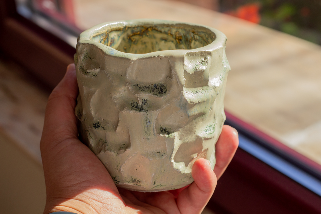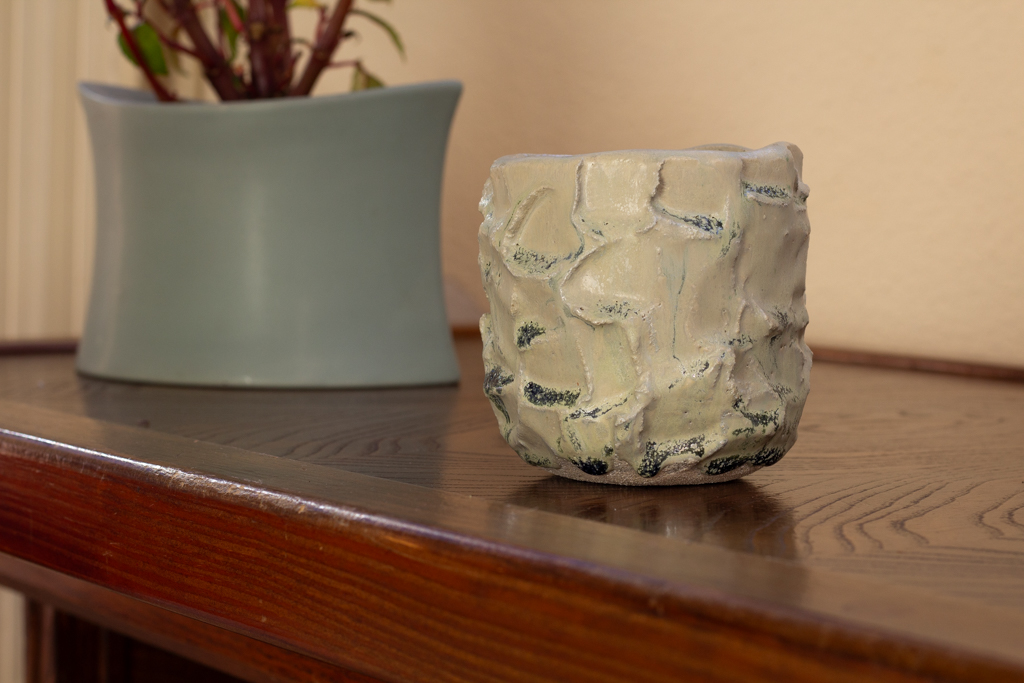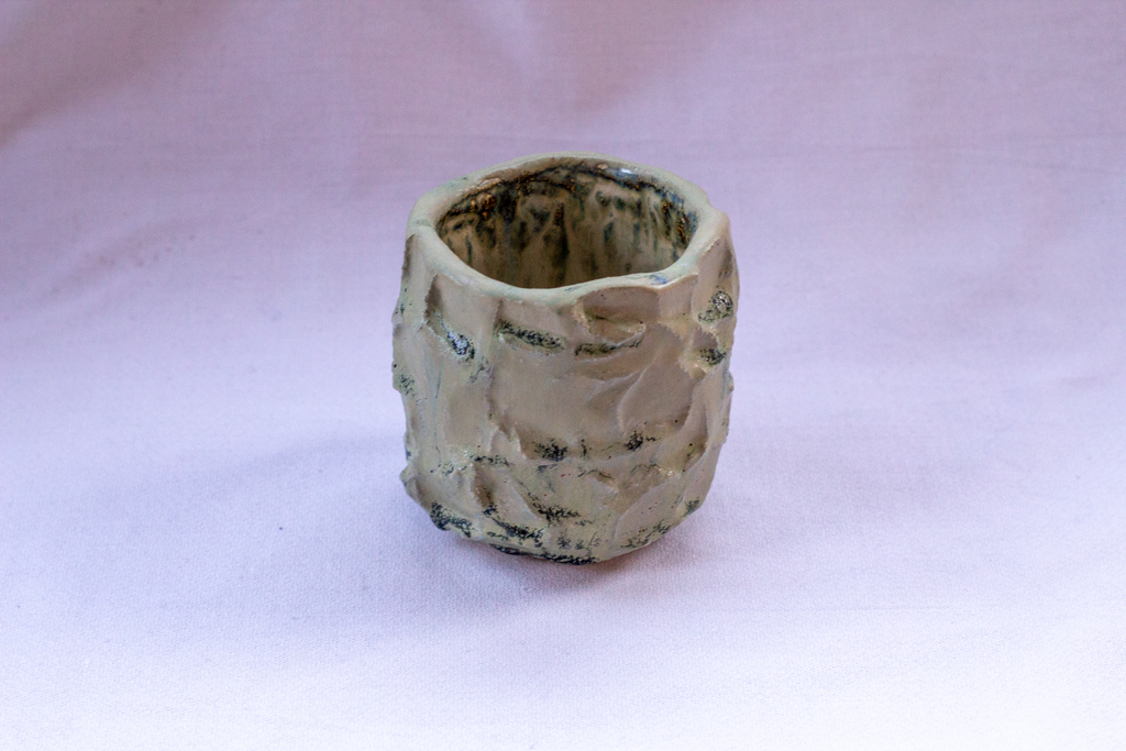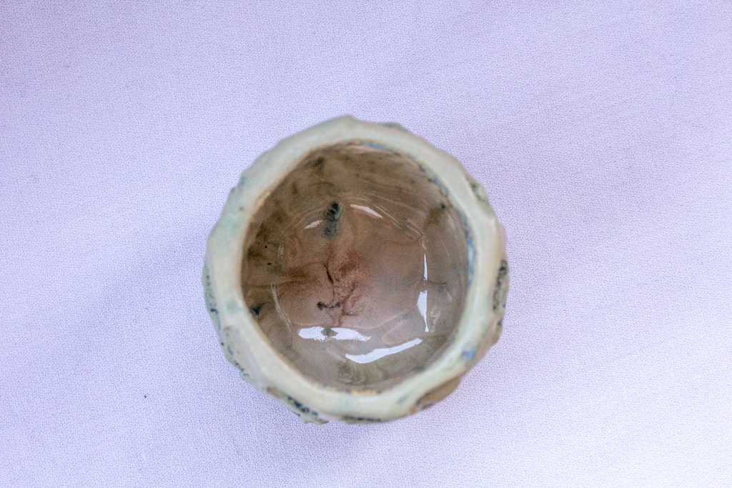Gres blanco chamotado, esmalte del taller, técnica del pellizco.